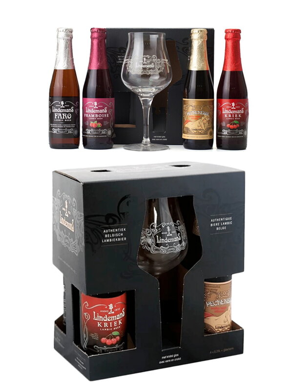 Darčekové balenia pivo s pohármi obsahuje:: 1x Lindemans Faro, 1x Lindemans Framboise, 1x Lindemans Pecheresse, 1x Lindemans Kriek.