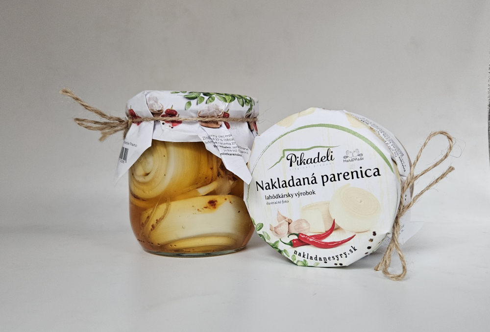 Polomäkký, nezrejúci, polotučný, parený syr s cesnakovou jemne pikantnou plnkou naložený v oleji 360g